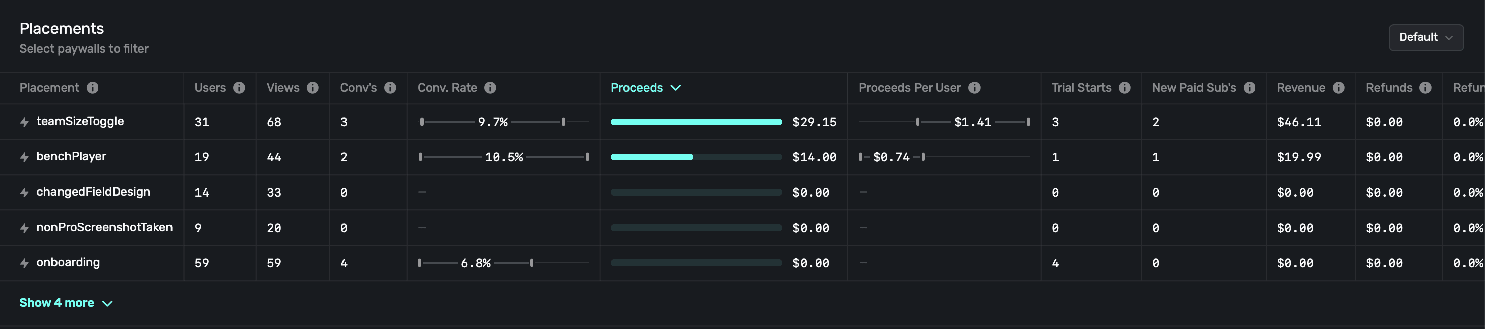 There are three main sections: Paywalls, Placements, and Graphs (defaults to Proceeds Per User). Each section has a toggle at the top right to change associated metrics.