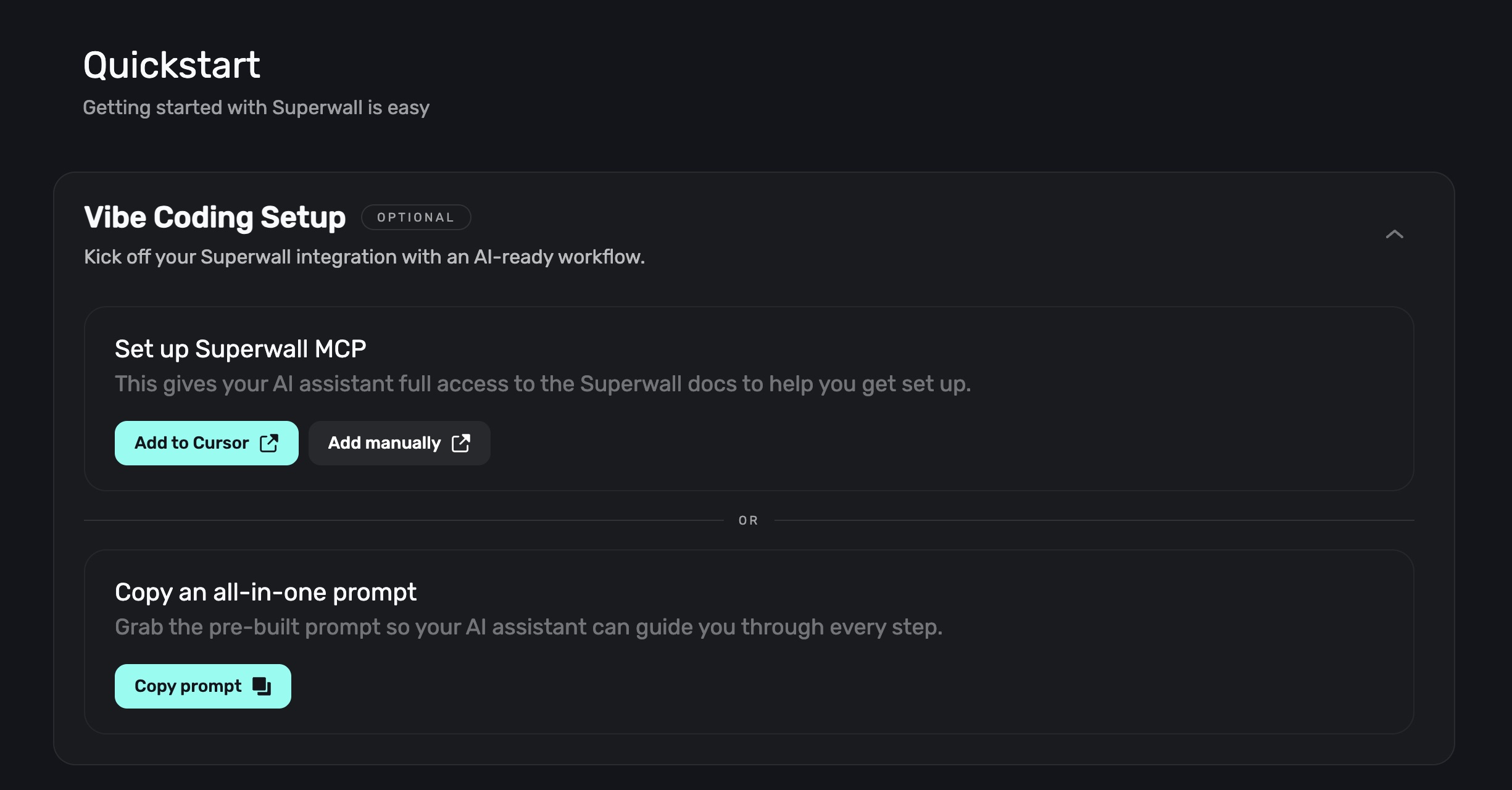 When you log in for the first time or add a new app, the Overview page displays a Quickstart wizard to help you get up and running. Complete the interactive checklist to finish your Superwall integration: