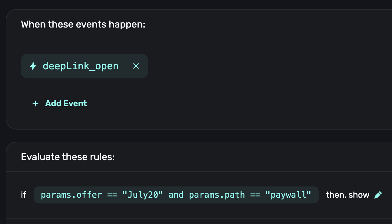 This rule will match the deep link myapp://paywall?offer=July20.